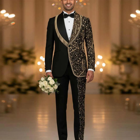 Jacquard Men's Suit 3 Pieces Blazer Black Vest Pants One Button No Lapel Business Slim Fit Formal Wedding Groom Costume Homme
