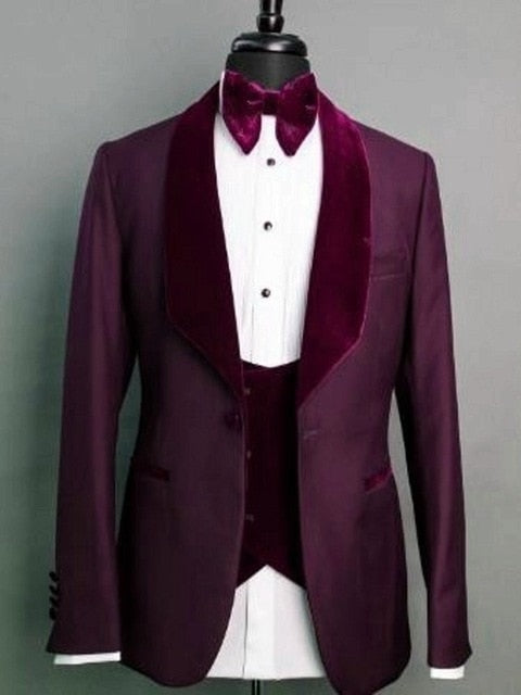 Elevate your formal attire with this Burgundy Groom Tuxedo featuring a luxurious shawl velvet lapel....