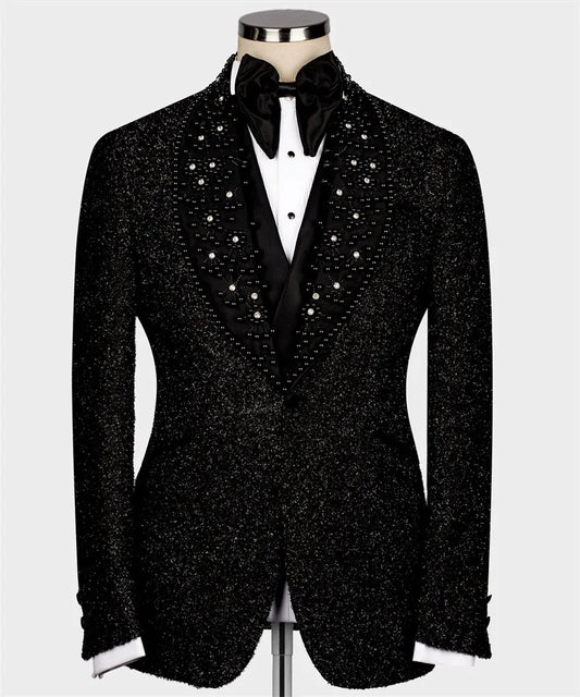 This customized groom tuxedo blazer is adorned with crystal appliques, adding a touch of luxury...
