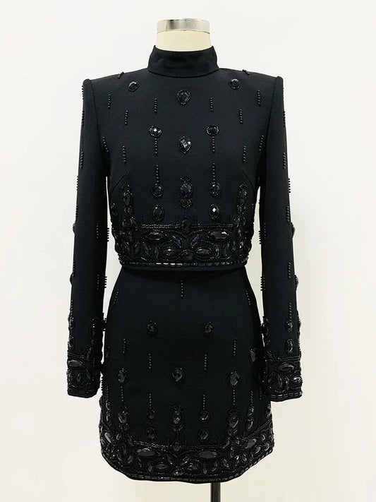 Designer Runway Suit Set Women's Slim Fitting Strass Diamonds Beaded Blazer Pants Set