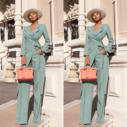 Designer Women Suits Set Blazer+Pants 2 Pcs Long Jacket With Belt Knee Length Coat Prom Dress Lace Up Party Gown Custom Made