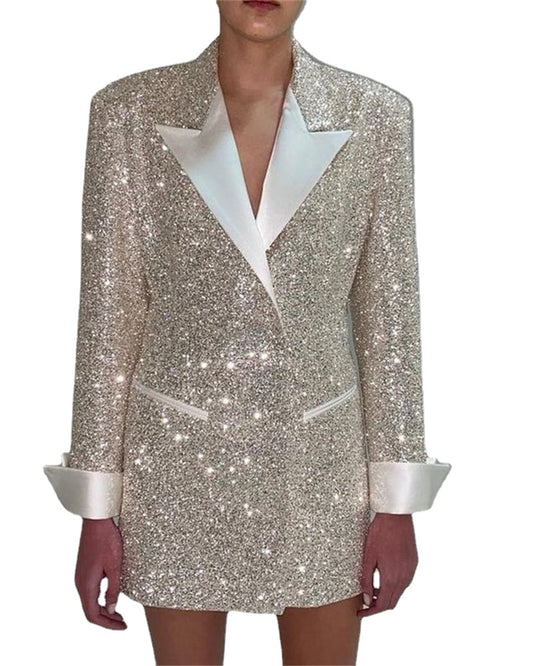 Glitter Sequin Women Suits 1 Pcs Silver Blazer Short Mini Prom Dress Jacket Satin Lapel Custom Size Coat Hot Girl Party Gown