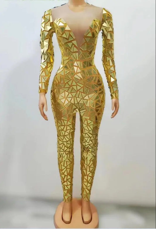 Gold Blue Red Flashing Full Mirrors Long Sleeves Transparent Jumpsuit Birthday Celebrate Costume Evening Women Dance Bodysuit
