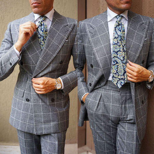 Gray Jacquard Peak-lapel Collar Double-breasted Men's Suit Banquet Wedding Dress Two-piece Set