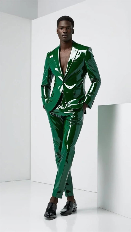 Make a bold impression with this green PU leather men's suit set, featuring a stylish...