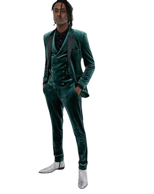 Green Velvet Groom Tuxedos for Wedding With Black Peak Lapel Men Suits 3 Pieces Best Blazer ( Jacket+Pants+Vest )