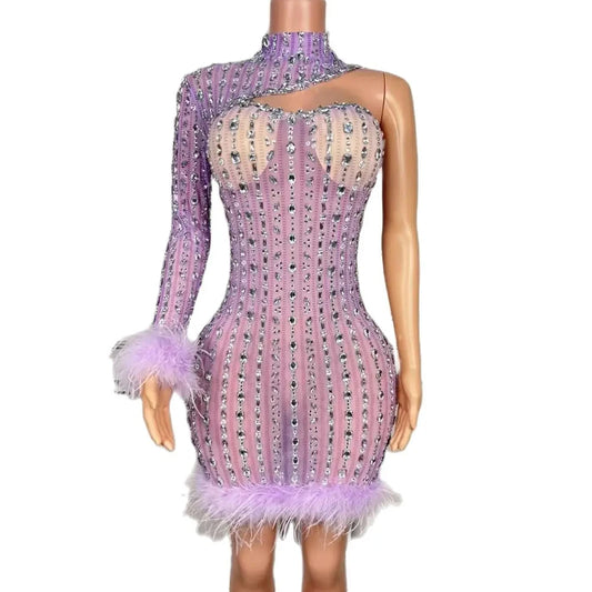 Lavender Color Sexy One Shoulder Feather Rhinestones See Through Sheath Evening Party Performance Costume Nightclub Stage Dress