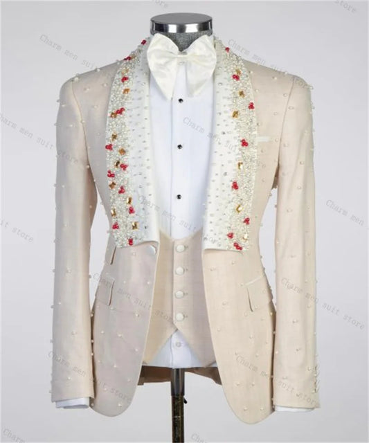 Luxury Crystals Beige Men Suit Set 2 Piece Blazer+Pants Trousers Customized Formal Office Jacket Groom Wedding Tuxedos Coat