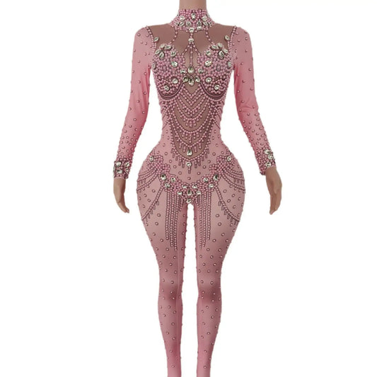 Elevate your performance and party wardrobe with our Luxury Crystals Stretch Pink Jumpsuits, designed to sparkle...
