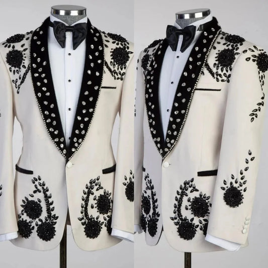 Luxury Men Suits Tailor-Made 2 Pieces Appliques Shawl Lapel Jacket Jacquard Rhinestone Blazer One Button Customized Coat Pants