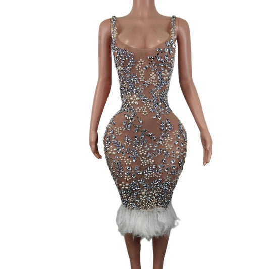 Luxury Sparkle Rhinestone Feather Sexy Brown Nude Mesh Dress Women Elegant Evening Party Birthday Performance Photoshoot Costume