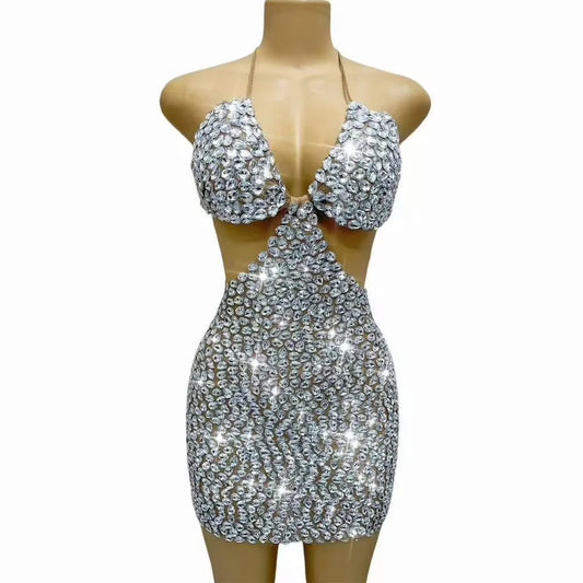 Dazzle every crowd in this luxury sparkly short dress for women, adorned with shimmering rhinestones...