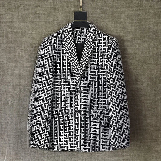 Men's Black White Geometric Pattern Blazer Two Button Long Sleeve Notched Lapel