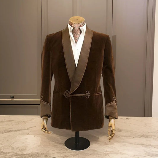 Men's Brown Velvet Blazer with Satin Lapel and Decorative Buttons
