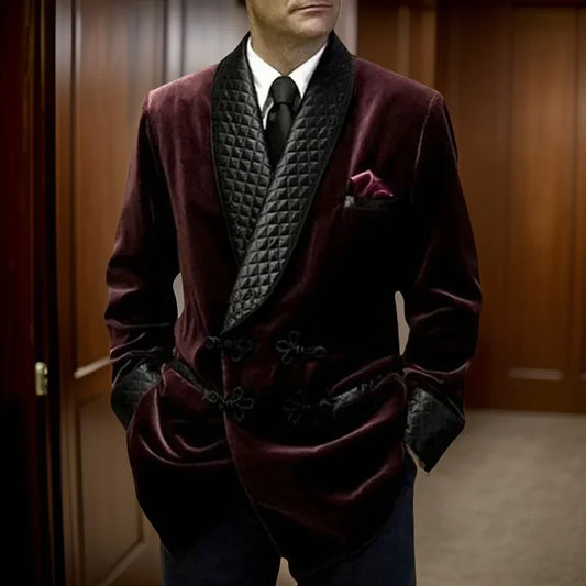 Men's Burgundy Velvet Quilted Smoking Jacket with Shawl Collar and Pocket Square