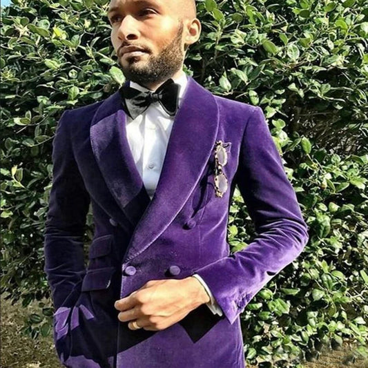 Men's Purple Velvet Double-Breasted Suit Jacket with Peak Lapels and Button Details