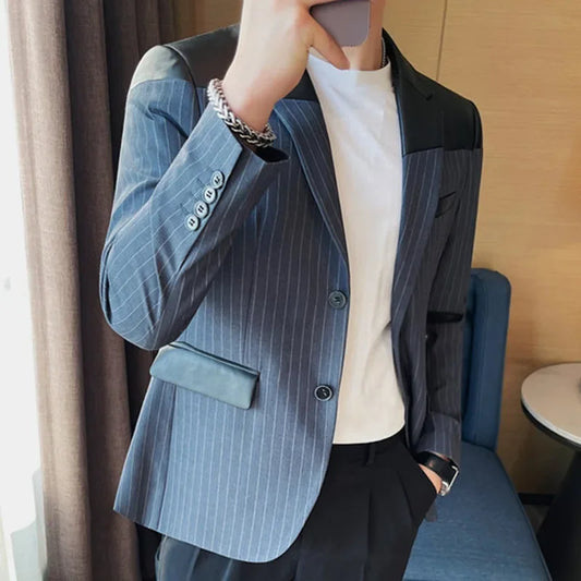 Men's Pinstripe Blazer with Leather Accents and Three Button Cuffs