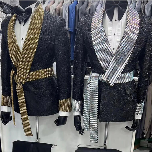 Men's Sequined Blazer Suit Set Elegant Tuxedo Jacket with Pants for Parties and Weddings Stylish Fashion Outfit