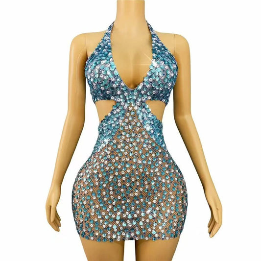 Sexy Flashing Seashell Sequins Rhinestones Halterneck Backless Dress Evening Birthday Celebrate Gown Show Stage Wear Outfit