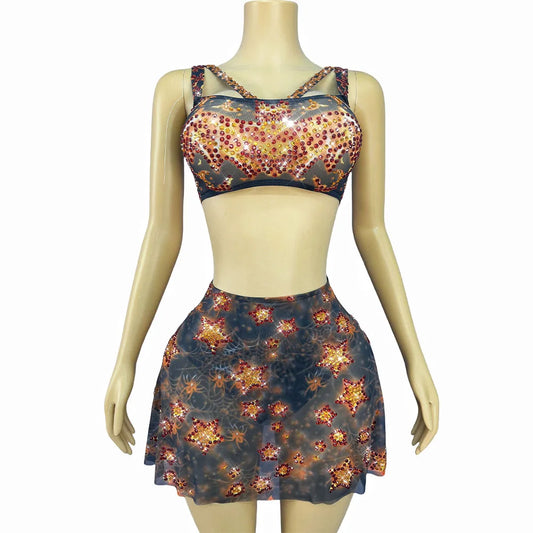 Sexy Printing Halloween Twinkling Rhinestones Top Skirt Split Dress Set Birthday Party Show Outfit Stage Performance Costume