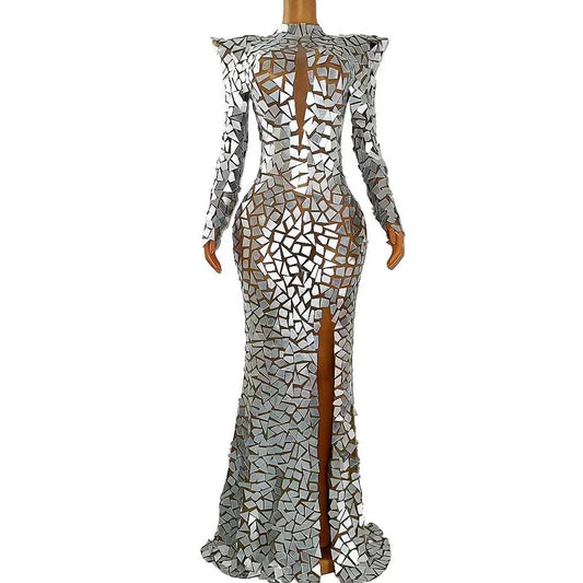 Sexy Stage Sparkly Silver Mirrors Luxury Celebrate Glisten Dress Singer Stage Show Performance Photoshoot Dress