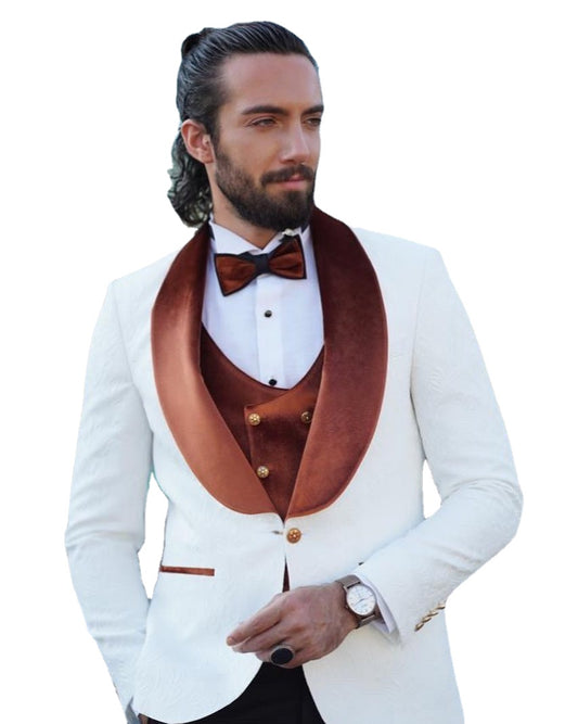 Blazer Sets Masculine Suit White Jacquard Blazer Brown Velvet Collar and Vest 3-Piece Luxury Boyfriend Suit for Wedding Tailcoat