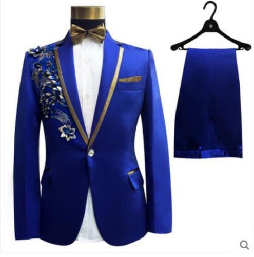 This 2-piece men's suit set includes a blue jacket, pants, featuring elegant embroidery in white,...