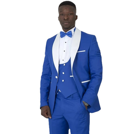 Blue Men Suits White Shawl Lapel Business Wear Wedding Groom Prom Tuxedos Formal Party Custom Made Blazer Sets Jacket+Vest+Pants