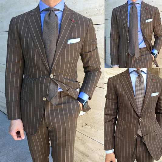 Introducing our Handsome Brown Stripes Lapel Men's 2-Piece Suit, featuring a tailored fit that combines...
