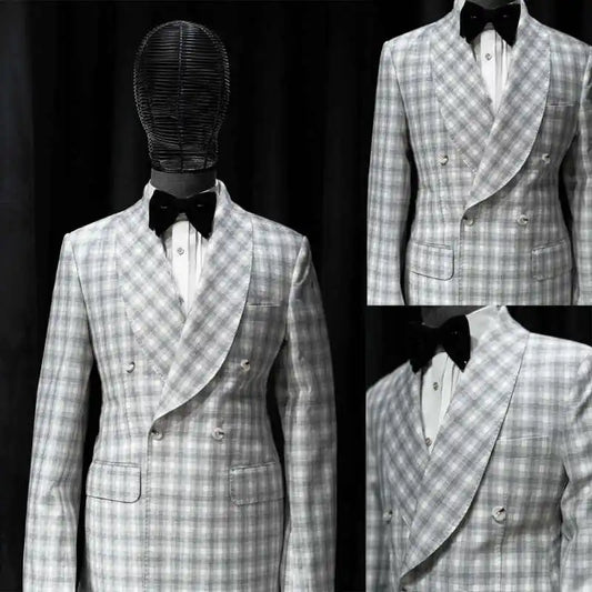 Plaid Men Wedding Suits Shawl Lapel Tuxedo Double Breasted Groom Wear 2 Pcs Jacket Pants Business Evening Party Customized
