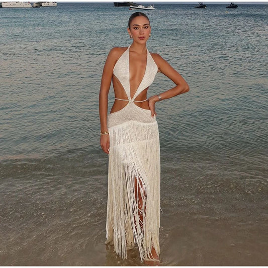 Sexy Knit Tassels Halter Dress Women Hollow Out Backless Lace Up Sleeveless Slim Long Dresses Summer Holiday Beach Robes