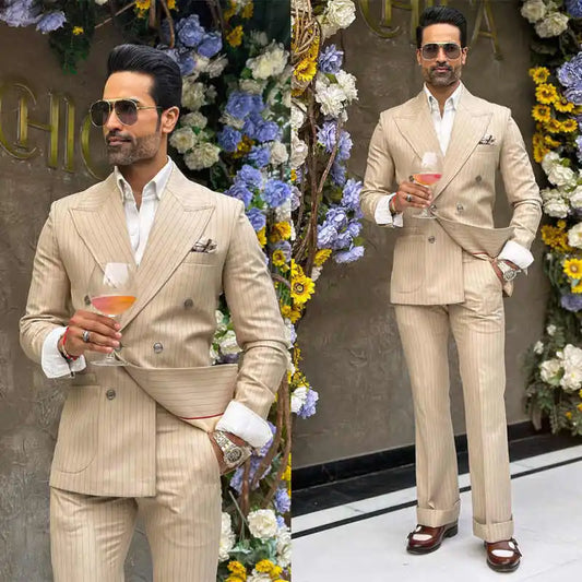 Pinstriped Elegant Men Wedding Suits Peak Lapel Double Breasted Tuxedos Groom Party 2 Pcs Blazer Pants Party Customized Suit