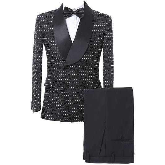 Men's Suit Double Breasted Shawl Lapel Slim Fit Double Breasted Plaid Suit Jacket Pants Formal Two Pieces Set Wedding