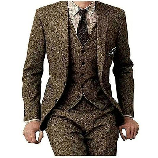 Men's Tweed Herringbone Slim Fit Brown Tan Tuxedos Vintage Blazer Jacket Vest Pants Groom Wedding Vintage 3 Piece Slim Fit Suit