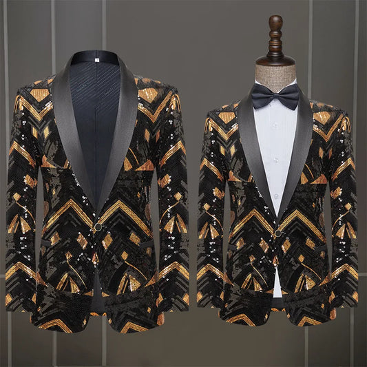 Men's Coat Black Gold Sequins Blazer Performance Dress Host Night Club Wedding (Only Jacket)