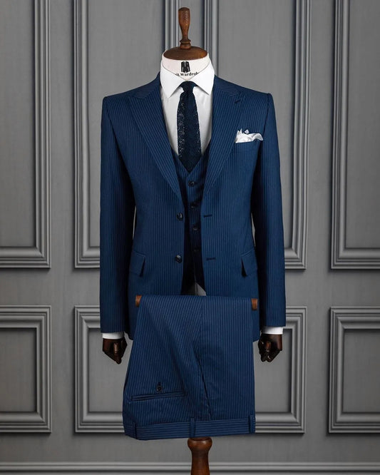 Navy Blue Stripe Suit For Men Tuxedo Homme Full Wedding Slim Fit 3 Pieces Custom Gentleman Modern Formal Suits For Busniess