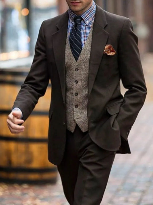 Men Suits Dark Brown Herringbone Vest Suit Customized Slim Fit Wedding Groom Tuxedos for Formal Csaual Jacket+Pant+Vest 3Pcs