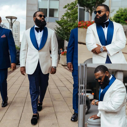2 Pieces Wedding Tuxedos for Men White Jacket Blue Pants Groom Groomsmen Suit Men' Business Casual Wear