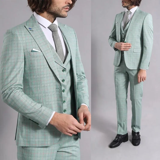 3 Pieces Green Plaid Men Wedding Tuxedos Blazer&Pants&Vest Groom Groomsmen Suit Custom Made Men Suits