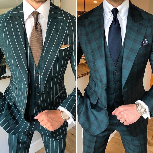 Dark Green Striped/Check Suit Men'S Tuxedo Men'S Full Wedding Slim Fit 3-Piece Custom Gentleman Modern Formal Suits For Business