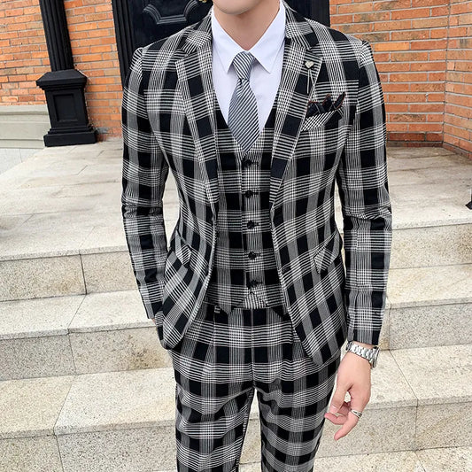 Plaid Print Men suitas Office formal Business Suits Casual Slim fit Wedding 3 pcs set