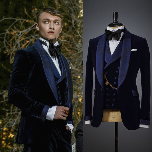 Blue Retro Court Style Wedding Men Suits Velour Slim Fit Tailor-Made Groom 3-Pieces Formal Occasions Party Singer Costume Made