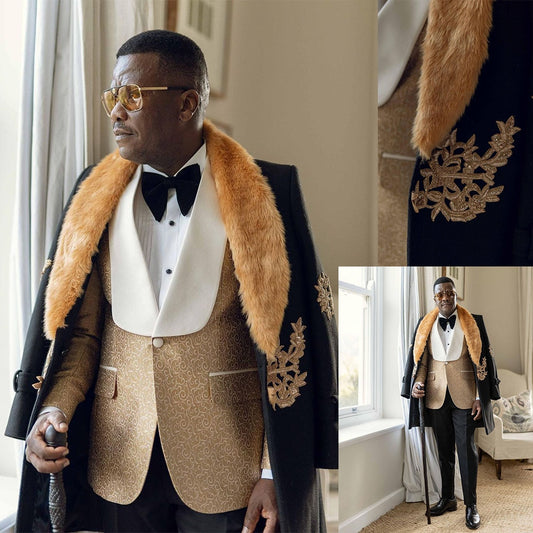 New Luxurious Winter Man Overcoat Long-length Plush Collar Men Suits Appliques Cashmere One-Piece Jacket Custom Wedding Tuxedos