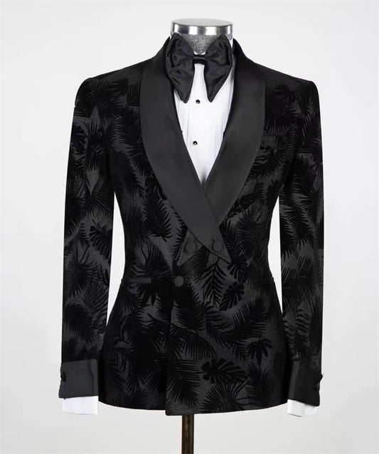 Black Leaf Printed Men Suit Blazer 1 Pcs Coat Satin Lapel Designer Wedding Prom Dress Jacket Custom Made Office Outfit Costume