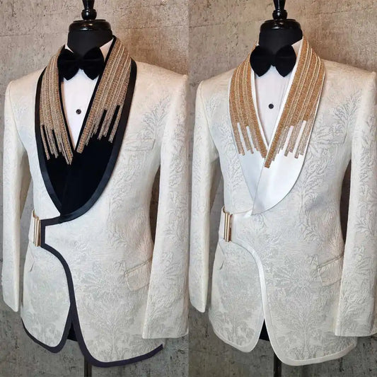 Designer Wedding Tuxedos Beaded Jacquard Men Suits Shawl Lapel 2 Piece Set Jacket Pants Unique Groom Blazers Customized