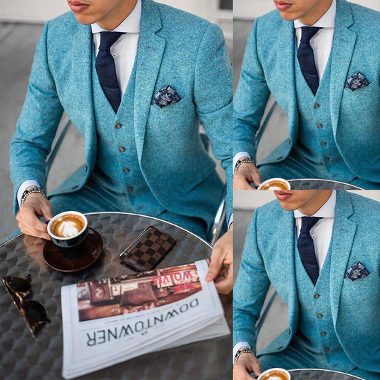 Light Blue Woolen Men Suits 3 Pieces Winter Warm Wedding Tuxedos Formal Business Custom Made (Blazer+Pants+Vest)