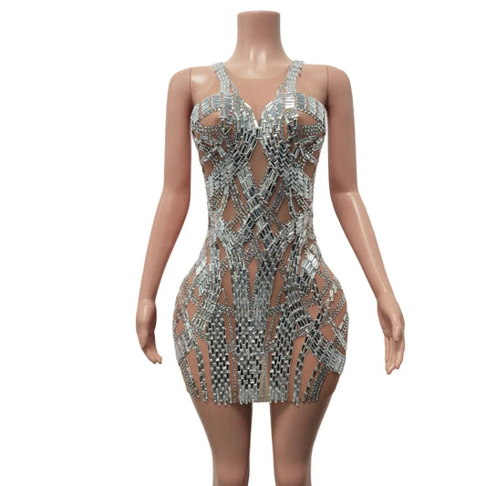Shining Rhinestone-Embellished Mesh Bodycon Dress for Women Perfect for Birthdays, Parties, and Stage Performances