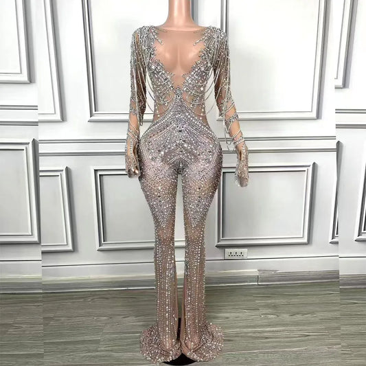 Luxury Rhinestones Chain Sheath Jumpsuit Women Evening Party Performance Costume Nightclub Singer Dancer Photoshoot Stage Wear