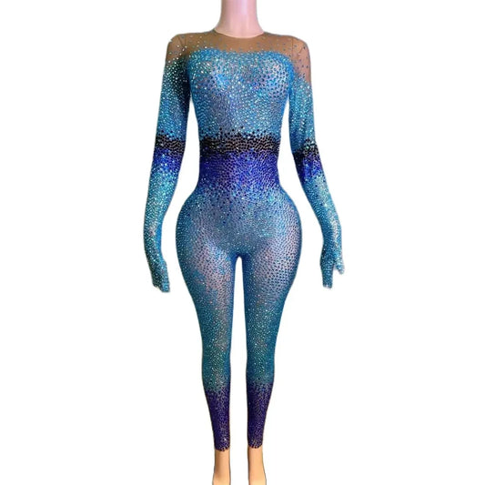 Sparkly Blue Rhinestones Jumpsuit Women Stretchy Bodysuit Nightclub Party Outfit Singer Dancer Performance Photoshoot Costume