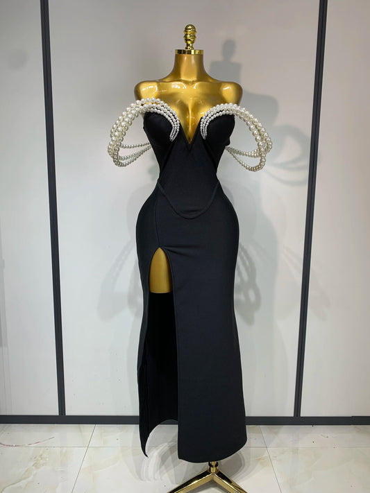 Women Luxury Designer Pearls V Neck Maxi Long Bandage Bodycon Dress Celebrity Evening Party Birthday Gowns Singer Stage Costumes